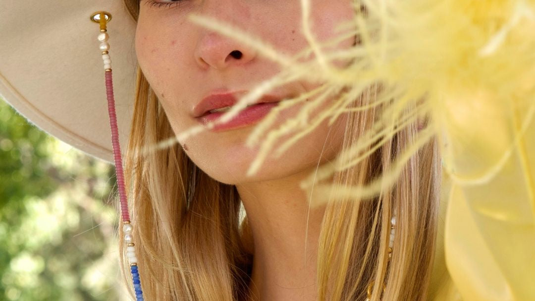 WEAR LONG: toggle bar first, string the jewelry up through the bottom of the hat's grommet hole, and wrap around the crown. Pull the toggle bar down through the second grommet hole, and attach toggle to the charm side of the stand. Drapes low like a necklace!